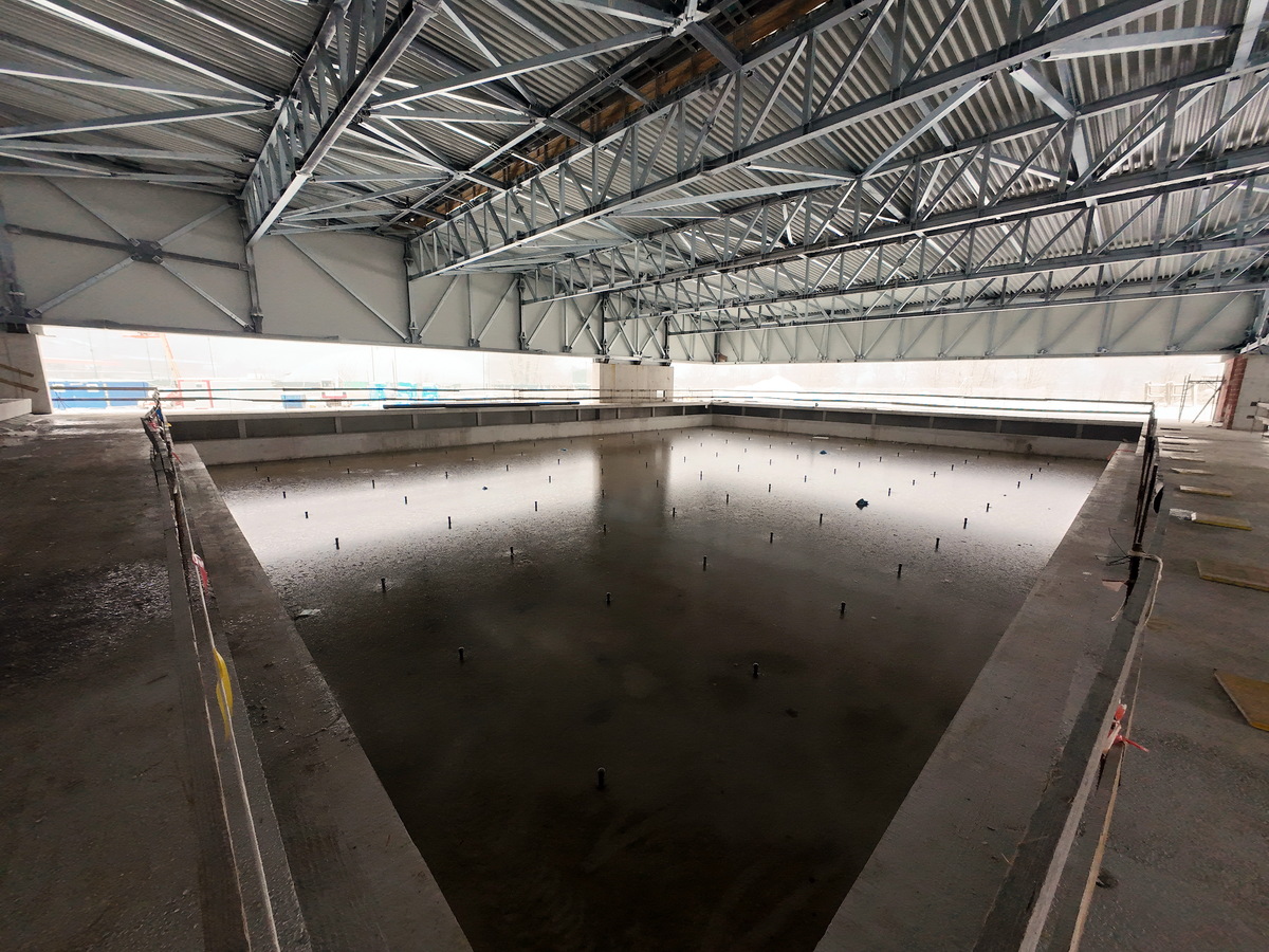 V pomladnih in poletnih mesecih so se dela intenzivno nadaljevala. Med drugim se je izvedlo betoniranje obeh bazenskih školjk ter kompenzacijskih bazenov, izdelala se je pritlična plošča, pozidale so se stene v kletnih prostorih in izvedla hidroizolacija okoli objekta. Vgrajene so bile tudi strojne in elektroinštalacije, ki so del betonske konstrukcije, hkrati pa se je začela montaža jeklene konstrukcije. Poleg tega so bile zabetonirane stene nad pritlično ploščo, pripravili pa so se tudi načrti za panelno in stekleno fasado.