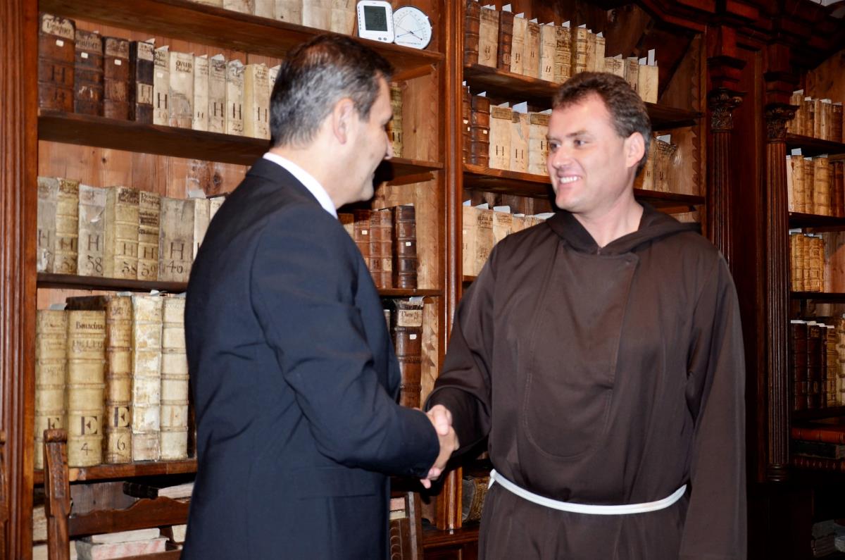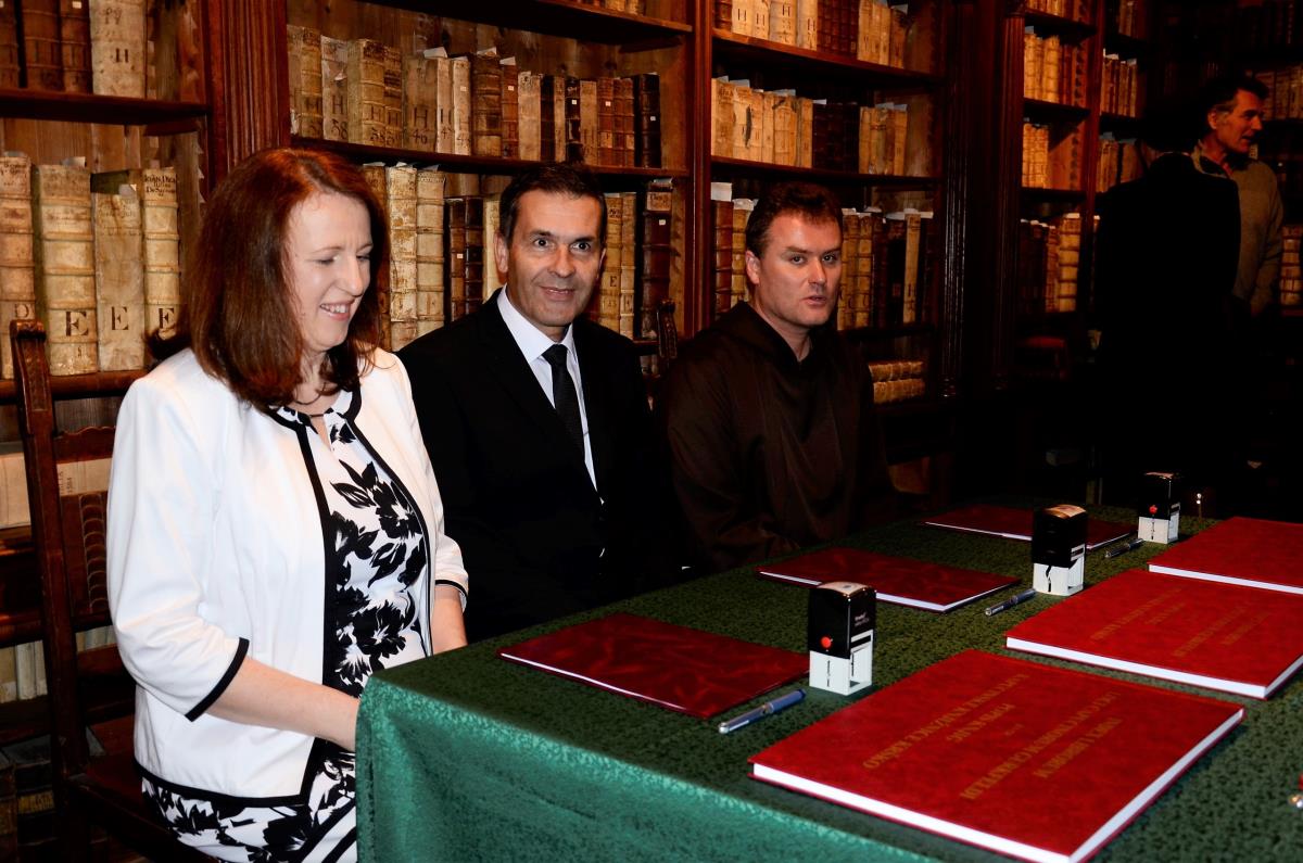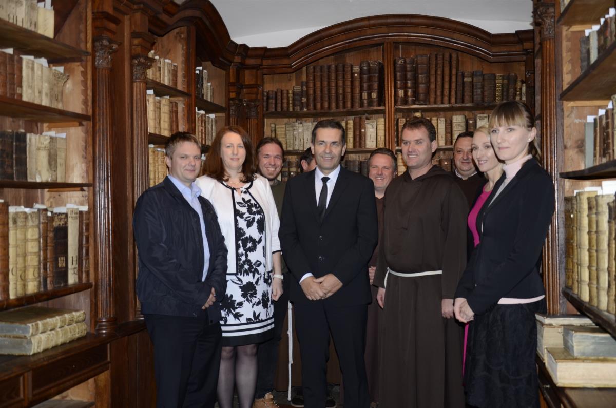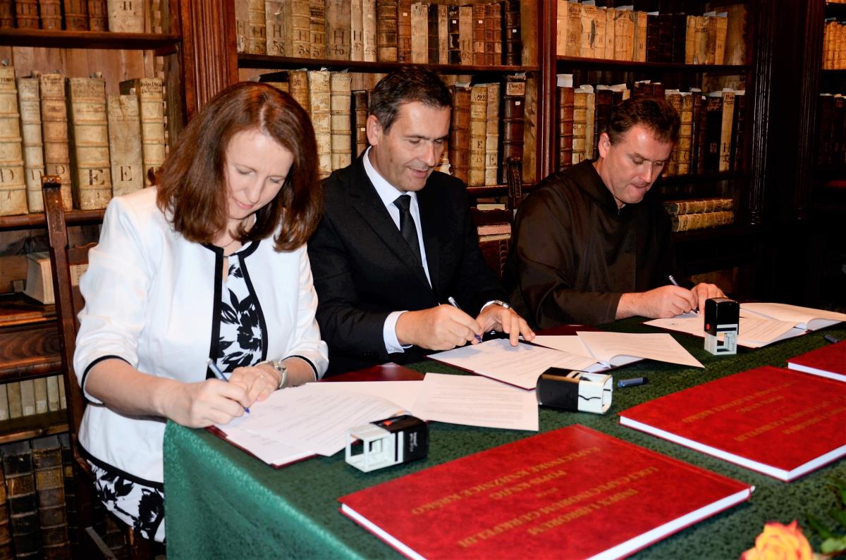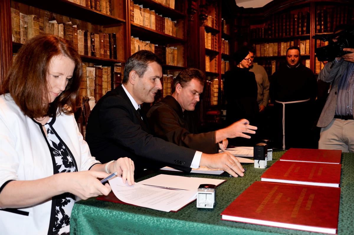 Krško, 24. november 2017 – V okviru dnevov splošnih slovenskih knjižnic so 22. novembra v prostorih Kapucinske knjižnice brat Vladimir Kolenko, provincialni minister kapucinov, direktorica Valvasorjeve knjižnice Krško Urška Lobnikar Paunović in župan občine Krško mag. Miran Stanko podpisali pogodbo, s katero je slovenska kapucinska provinca uradno na krško knjižnico prenesla upravljanje kapucinske knjižnice z bogatim knjižnim fondom. Kot je ob tem poudaril župan, smo lahko Krčani upravičeno ponosni na zaklad Kapucinske knjižnice. Brat Vladimir Kolenko je dodal, da kapucini predajajo v hrambo knjižnici bogat del preteklosti in življenja, ki je potekal za zidovi samostana. Po besedah direktorice knjižnice Urške Lobnikar Paunović bodo še naprej nad zbirko neprecenljive vrednosti skrbno bdeli in jo ohranjali.