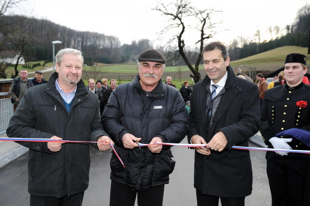 Župan občine Krško mag. Miran Stanko, predsednik sveta KS Senovo Vlado Grahovac in domačin Željko Golob so včeraj v okviru praznika KS Senovo slovesno odprli nov most pri športnem igrišču Dovško na Senovem.
