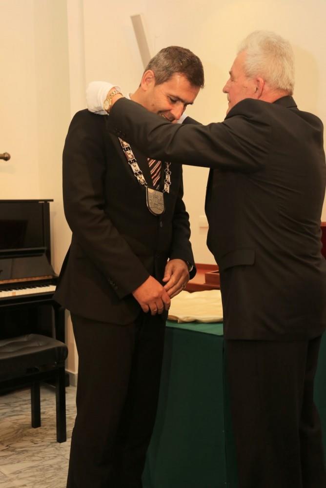 Najstarejši svetnik Jožef Zupančič je ob potrditvi mandata županu mag. Miranu Stanku slovesno predal župansko verigo kot mestno insignijo z grbom Občine Krško, ki predstavlja simbol odgovornosti izvoljene osebe občanom in se uporablja ob slovesnih priložnostih.