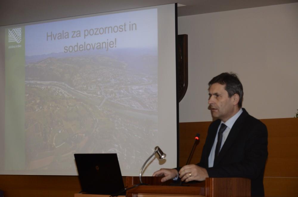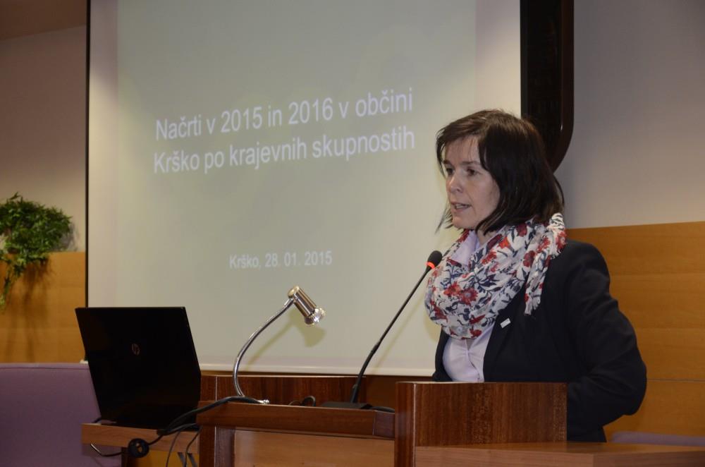 Direktorica občinske uprave Melita Čopar je uvodoma predstavila predlog proračuna za leti 2015 in 2016, po katerem naj bi prihodki v letu 2015 znašali 36,6 milijona evrov, odhodki pa okoli 37 milijonov evrov, v letu 2016 pa prihodki 31,9 milijona evrov, odhodki pa 32 milijonov evrov. V okviru tega je sledil opis načrtovanih investicij v letih 2015 in 2016 po posameznih krajevnih skupnostih, med katerimi so skupne in večje predvsem nadaljevanje izgradnje obvoznice v Krškem, program modernizacije občinskih cest, obnova javne razsvetljave, projekt Posavska špajza z obnovo tržnice, nadaljevanje širokopasovnih povezav, program gospodarskih javnih služb in dokončanje sodobne kompostarne.