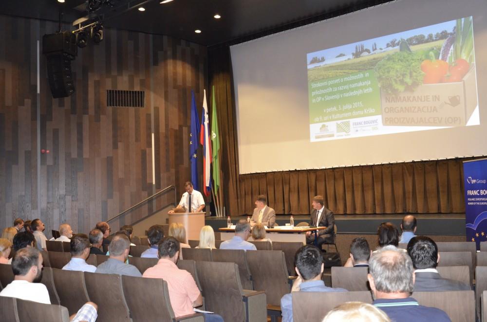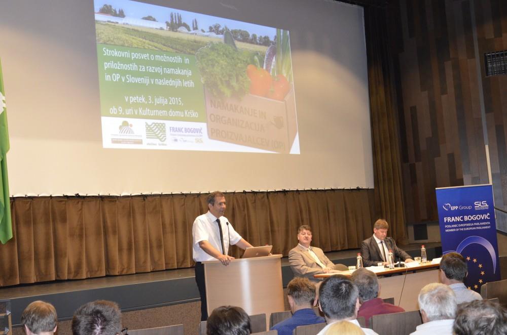 Danes je v organizaciji Občine Krško, KGZS Zavoda Novo mesto in poslanca Evropskega parlamenta (SLS/EPP) Franca Bogoviča potekal strokovni posvet z naslovom: NAMAKANJE IN ORGANIZACIJA PROIZVAJALCEV (OP) – možnosti in priložnosti za razvoj namakanja in OP v Sloveniji v naslednjih letih. Cilj strokovnega posveta je bil seznaniti domačo strokovno javnost, odločevalce in proizvajalce oz. pridelovalce sadja ter zelenjave in širšo slovensko javnost z najbolj razvitimi sistemi organizacij proizvajalcev (OP) in namakanja v EU. Namen je bil tudi seznaniti javnost z dejstvom, kako pomembne so organizacije proizvajalcev (OP) in pregledati, kaj se trenutno dogaja na področju organiziranja OP v Sloveniji ter prenesti praktične izkušnje iz Belgije širšemu krogu zainteresiranih z željo, da bi bile prve organizacije v Sloveniji ustanovljene že letos oz. v začetku leta 2016.