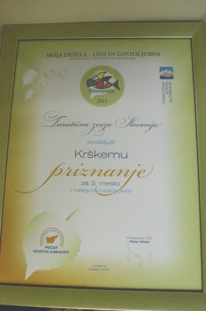 Ob zaključku letošnje vseslovenske akcije Turistične zveze Slovenije (TZS) Moja dežela – lepa in gostoljubna, ki ocenjuje urejenost in gostoljubnost krajev po vsej Sloveniji ter poteka pod častnim pokroviteljstvom predsednika države Boruta Pahorja, so včeraj zvečer v Novi Gorici podelili priznanja najboljšim. V kategoriji mestnih jeder je Krško zasedlo 3. mesto za Kamnikom in Idrijo.
