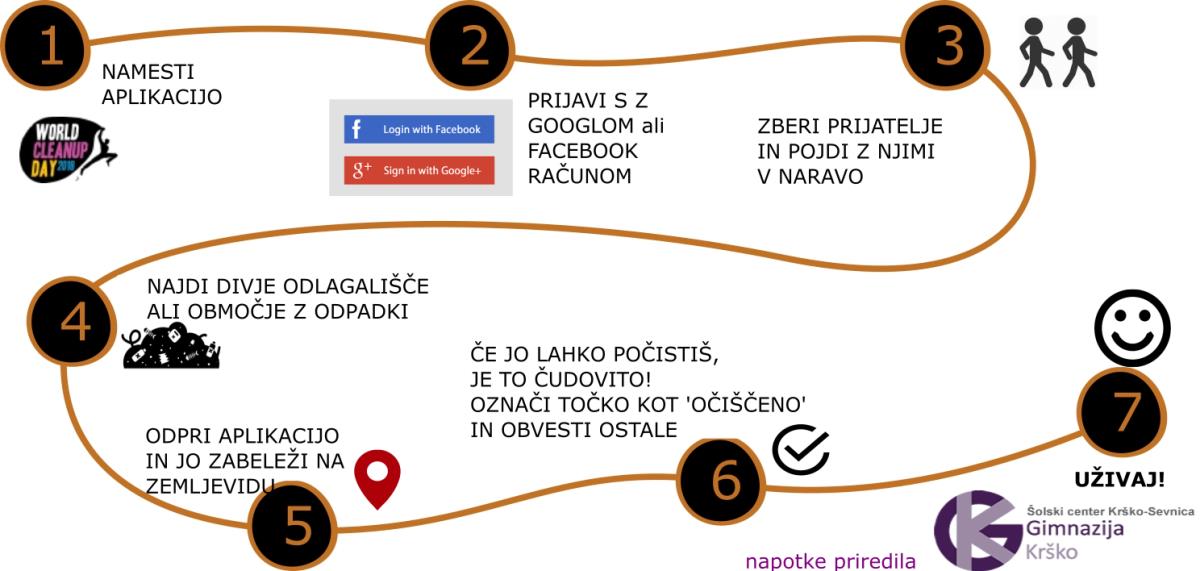 V ta namen so na svetovnem nivoju akcije zasnovali aplikacijo za mobilne telefone, s pomočjo katere lahko ob kateremkoli načinu aktivnega preživljanja časa v naravi v primeru, če naletimo na primer brezvestnega odlaganja odpadkov v naravi, le-to enostavno in hitro zabeležimo na svetovni zemljevid. Navodila za uporabo aplikacije so dijakinje in dijaki G2A priredili v slovenščino in oblikovali letak, ki si ga lahko ogledate na spletni strani ocistimokrsko.si, ki so jo prav tako oblikovali za namen akcije, ki jo koordinirajo.