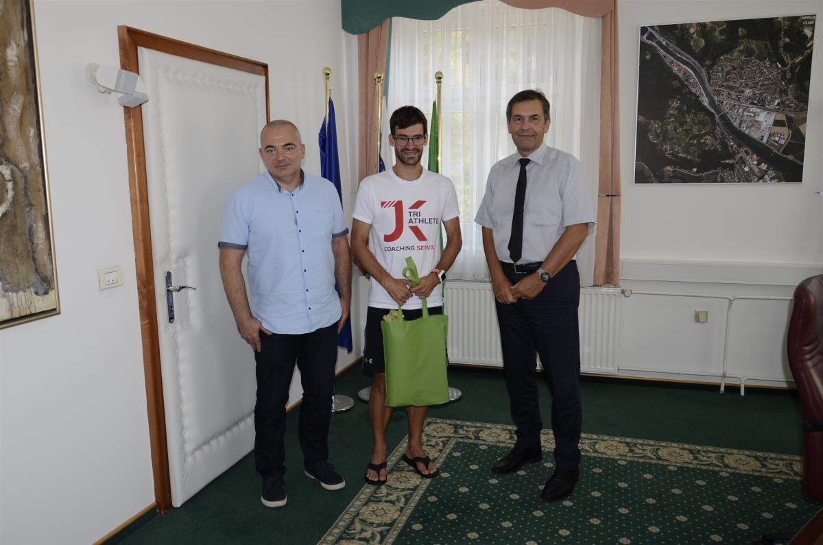 Krško, 18. september 2018 – Župan občine Krško mag. Miran Stanko in predsednik Komisije za šport Občine Krško Boštjan Pirc sta včeraj dopoldne čestitala krškemu triatloncu Jaroslavu Kovačiču, ki je 8. septembra zmagal na dolgem triatlonu (3.8 km plavanja, 180 km kolesarjenja in 42.2 km teka) v nizozemskem Almereju, pri tem pa postal prvi Slovenec, ki je "ironman" preizkušnjo zaključil pod osmimi urami.