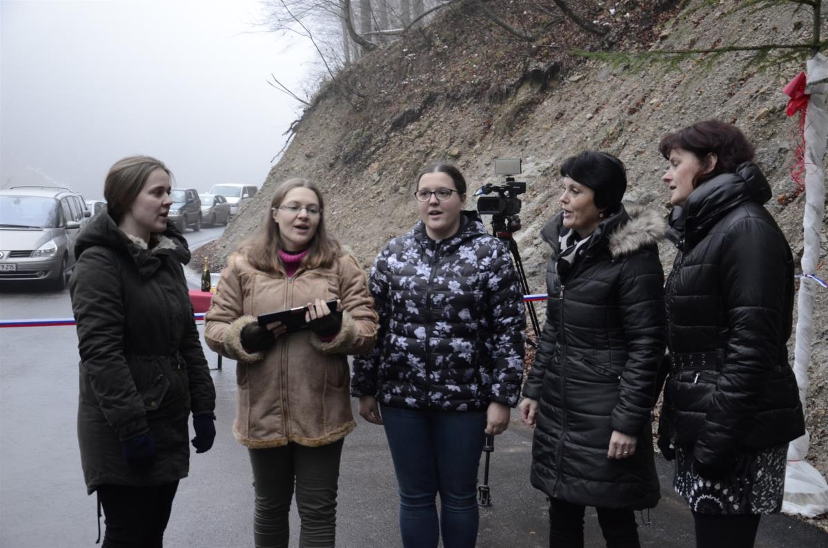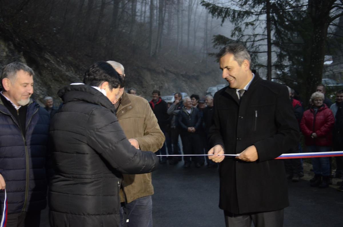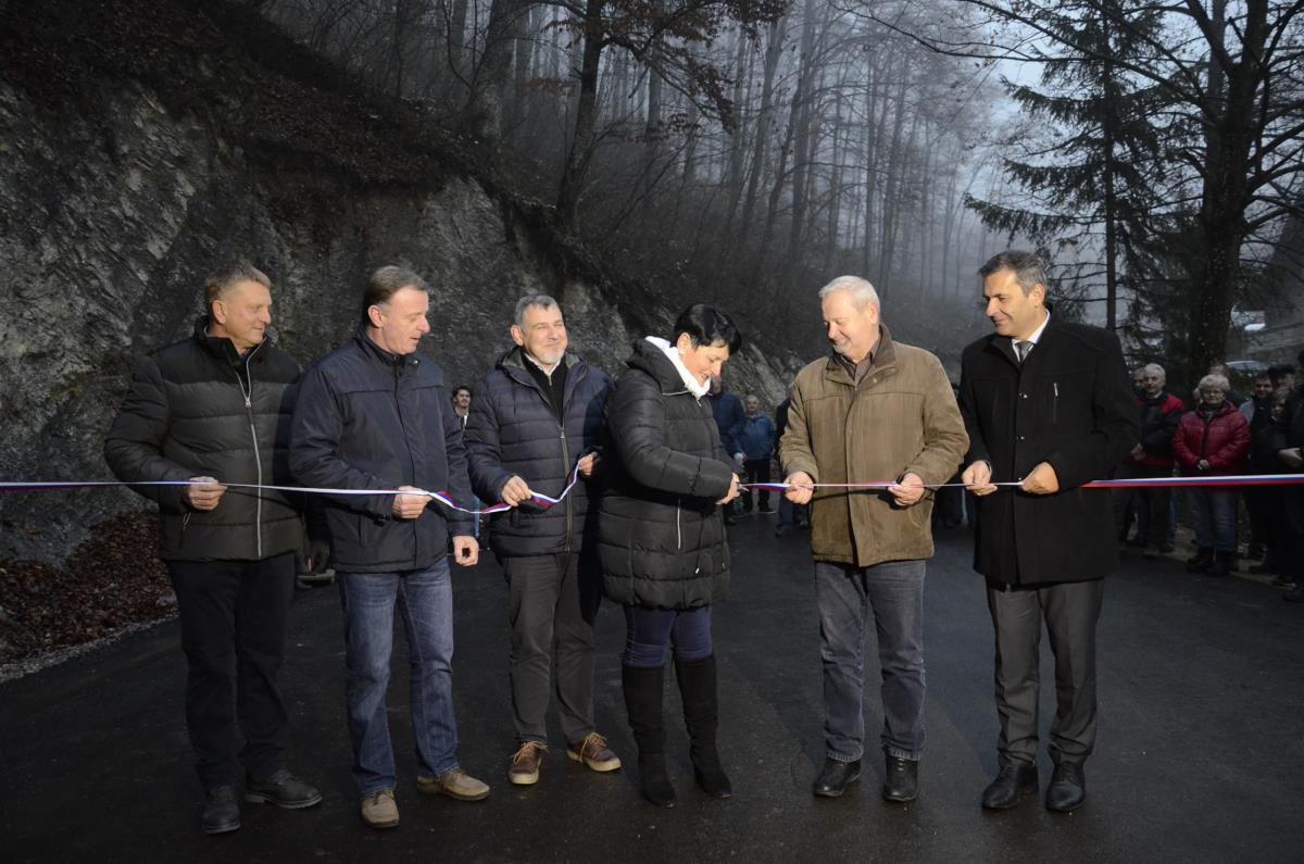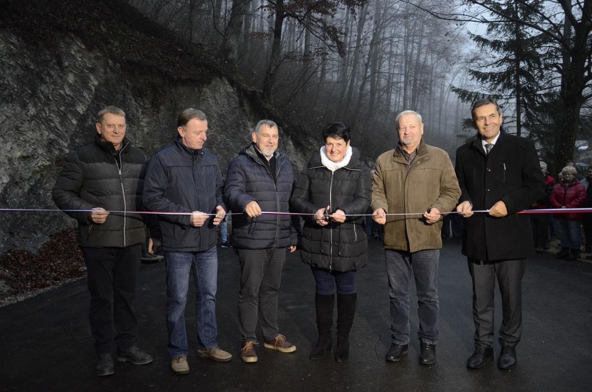 Krško, Sevnica, Mrzla Planina, 22. november 2018 – Župana občin Krško in Sevnica mag. Miran Stanko in Srečko Ocvirk ter predsedniki krajevnih skupnosti Zabukovje, Blanca in Senovo Jože Baumkirher, Marjan Ločičnik in Vlado Grahovac so včeraj popoldne na Mrzli Planini skupaj z domačinko Marijo Dvoršak namenu predali obnovljen odsek ceste, ki povezuje krško in sevniško občino oz. območja krajevnih skupnosti Senovo, Blanca in Zabukovje. Prej makadamski kilometer dolg odsek je po obnovi razširjen in asfaltiran, urejene so brežine, kar bo omogočalo predvsem varnejši promet. Občini sta za to skupno naložbo namenili dobrih sto tisoč evrov.