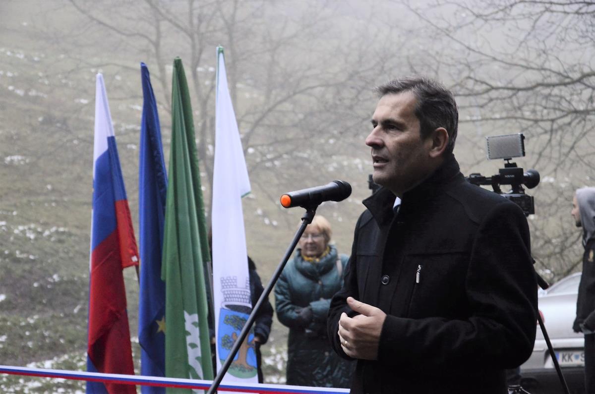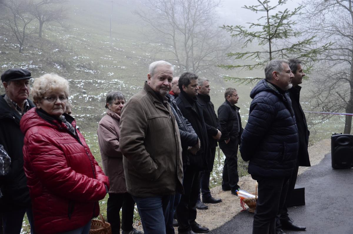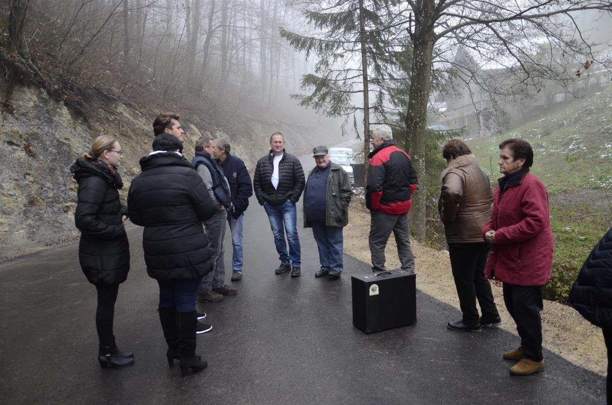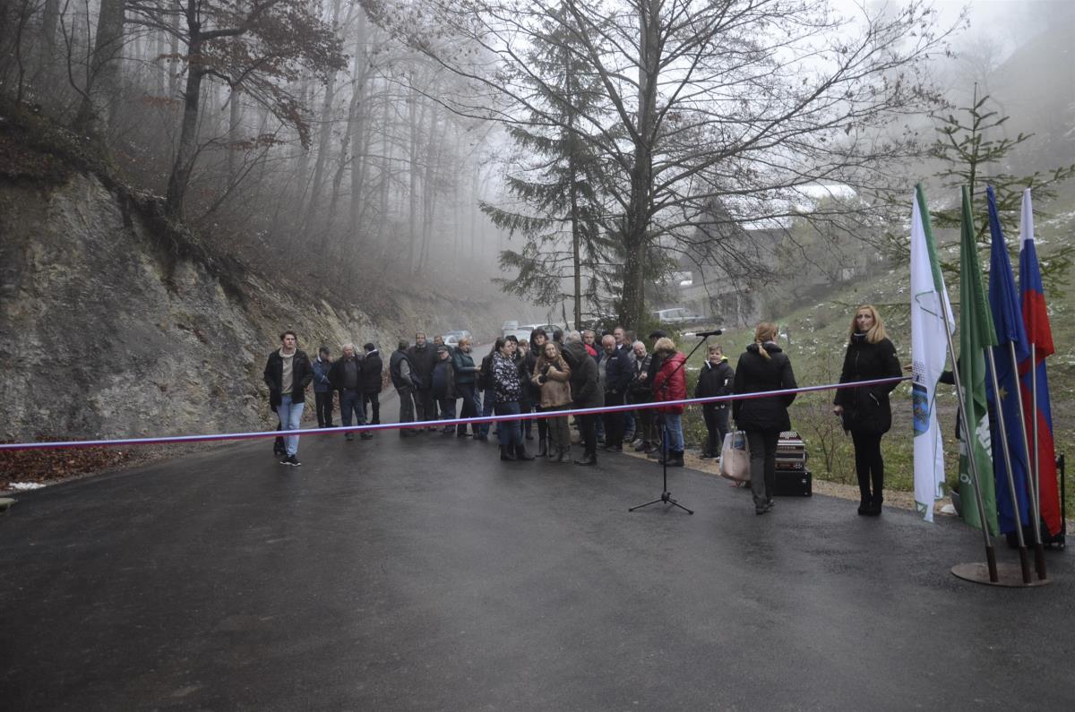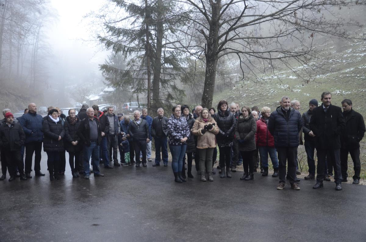 Krško, Sevnica, Mrzla Planina, 22. november 2018 – Župana občin Krško in Sevnica mag. Miran Stanko in Srečko Ocvirk ter predsedniki krajevnih skupnosti Zabukovje, Blanca in Senovo Jože Baumkirher, Marjan Ločičnik in Vlado Grahovac so včeraj popoldne na Mrzli Planini skupaj z domačinko Marijo Dvoršak namenu predali obnovljen odsek ceste, ki povezuje krško in sevniško občino oz. območja krajevnih skupnosti Senovo, Blanca in Zabukovje. Prej makadamski kilometer dolg odsek je po obnovi razširjen in asfaltiran, urejene so brežine, kar bo omogočalo predvsem varnejši promet. Občini sta za to skupno naložbo namenili dobrih sto tisoč evrov.