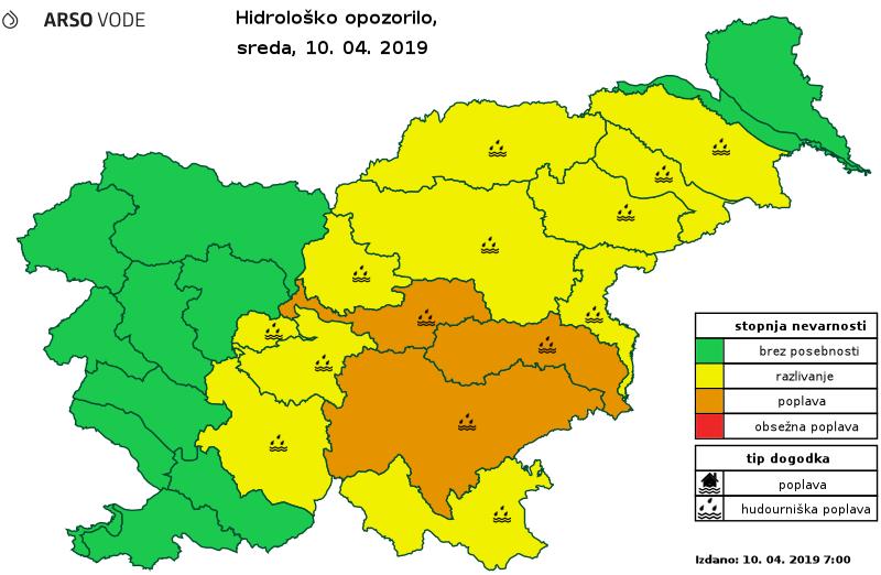 V sredo popoldne in v noči na četrtek je pojav lokalnih hudourniških razlivanj in poplav najbolj verjeten v porečju Krke, možen pa je tudi drugod v osrednji in vzhodni Sloveniji. V noči na petek lahko posamezne manjše reke in hudourniški vodotoki ponovno močno narastejo, zlasti na širšem območju Notranjske in Dolenjske.