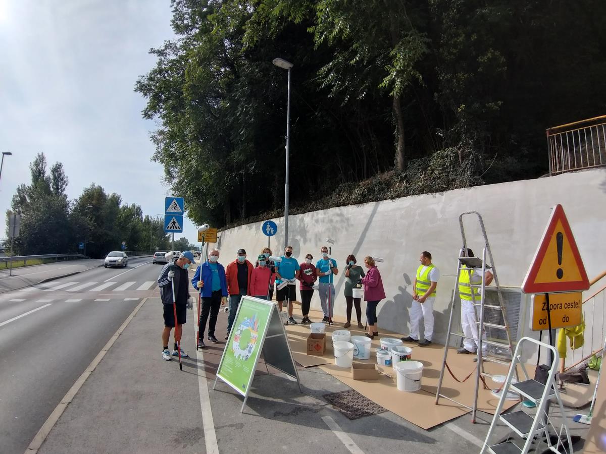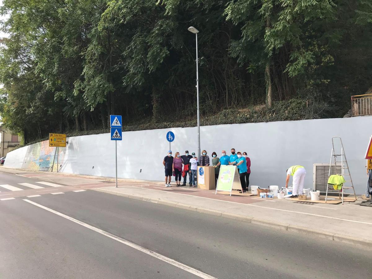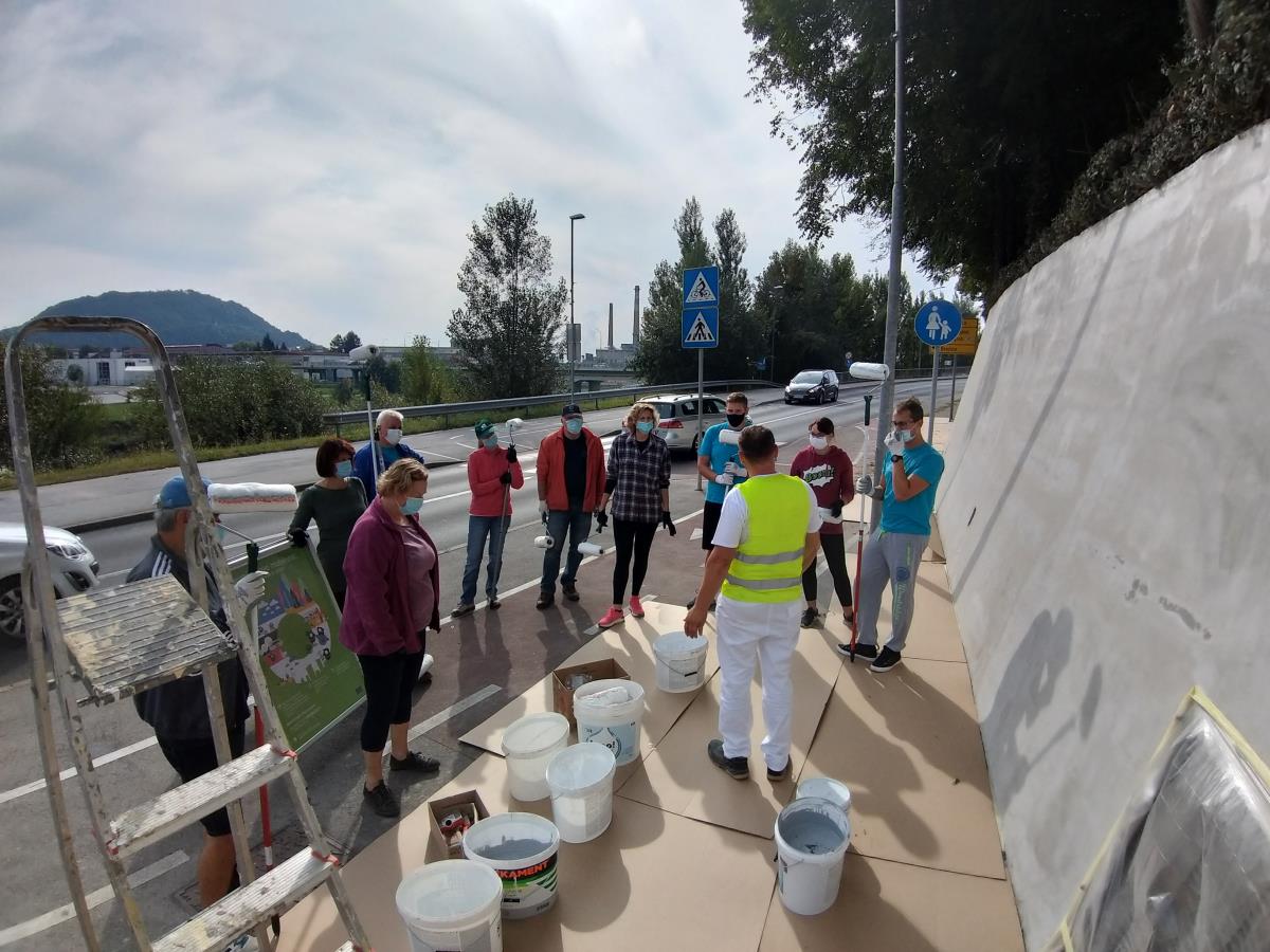 Krško, 21. september 2020 – Ob dnevu za spremembe in Evropskem tednu mobilnosti so direktorica občinske uprave Melita Čopar in vodje oddelkov občinske uprave skupaj s predsednikom Zveze prijateljev mladine Krško Vinkom Hostarjem in prostovoljci v soboto dopoldan prebarvali zid v Zatonu.