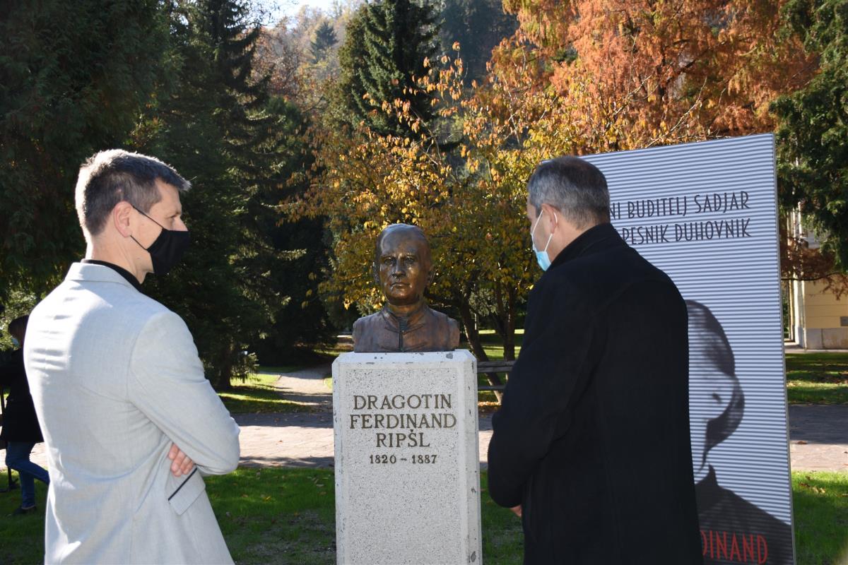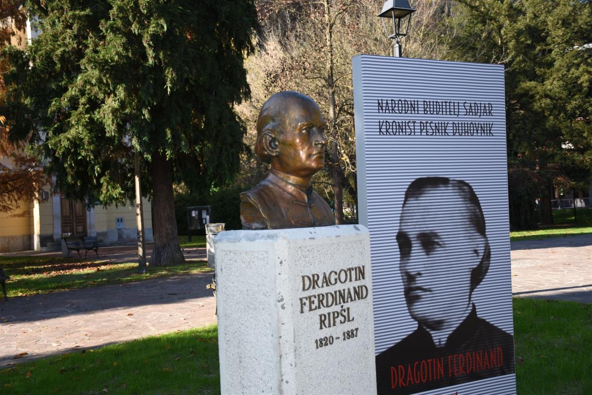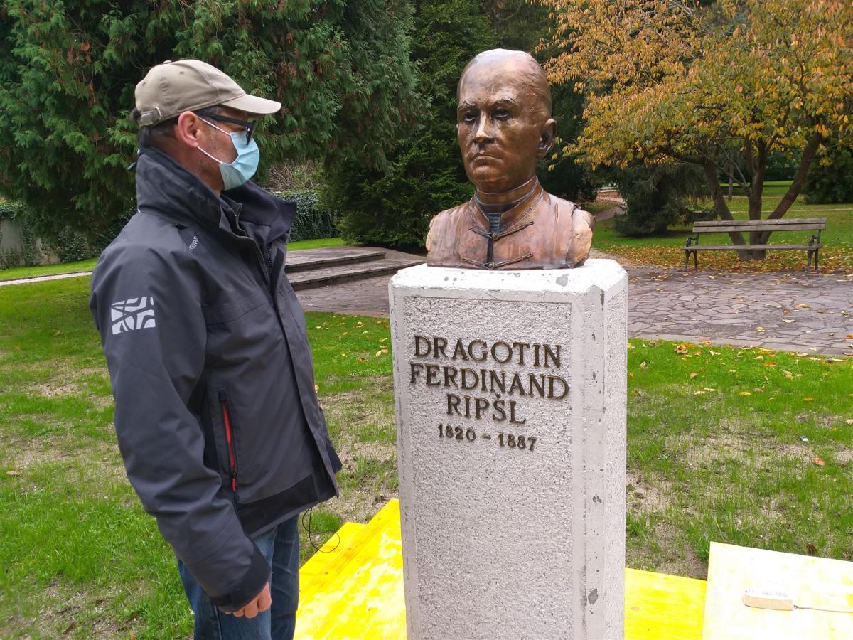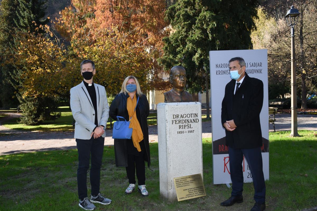 Krško, 6. november 2020 – Župan občine Krško mag. Miran Stanko in župnik Župnije Krško - Videm ob Savi Mitja Markovič sta v Gaju zaslužnih občanov v starem mestnem jedru Krškega odkrila doprsni kip duhovnika, pesnika, sadjarja, kronista in narodnega buditelja Dragotina Ferdinanda Ripšla ob njegovi 200-letnici rojstva.