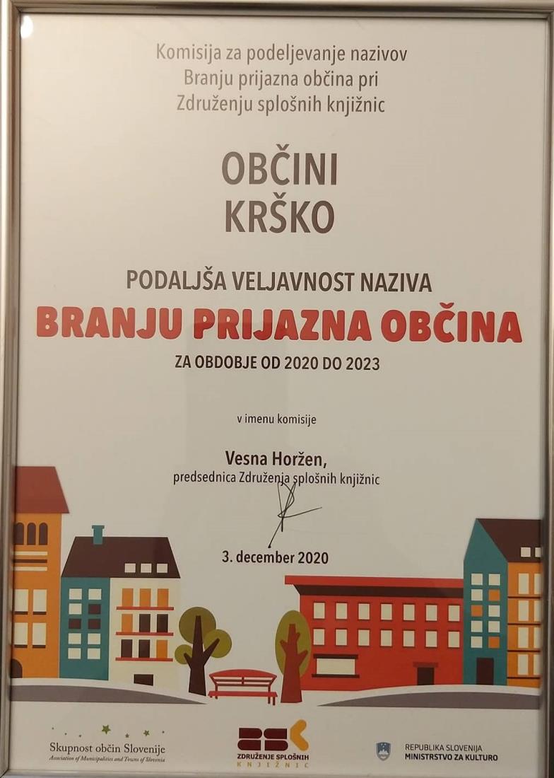 Krško, 4. december 2020 – Združenje splošnih knjižnic, Skupnost občin Slovenije in Ministrstvo za kulturo RS je že četrto leto podelilo nazive Branju prijazna občina tistim občinam, ki posebno pozornost posvečajo knjigi, bralni pismenosti in kulturi. Občina Krško se je vpisala med 14 občin, ki so naziv Branju prijazna občina podaljšale še za nadaljnja tri leta.