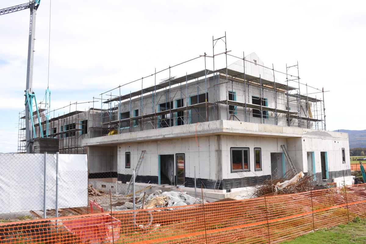 Krško, 9. november 2021 – Gradnja nove podružnične osnovne šole in vrtca v Velikem Podlogu, ki se je začela v maju, poteka v skladu z načrti. Trenutno je izvedena betonska plošča nad nadstropjem, objekt je pripravljen na pričetek montaže lesene strešne konstrukcije, kar je predvideno v prihodnjih dneh. Izvajajo se predelni zidovi, razvodi za elektro in strojne instalacije, zmontirano je že prvo stavbno pohištvo na fasadi pritličja. V kolikor bodo vremenske razmere dopuščale, se prične z vrtanjem vrtin za vgradnjo geosond. V teku je postopek za izbiro dobavitelja opreme. Objekt bi naj bil po terminskem planu dokončan do 30. 4. 2022, uporabno dovoljenje pa pridobljeno do 30. 6. 2022.