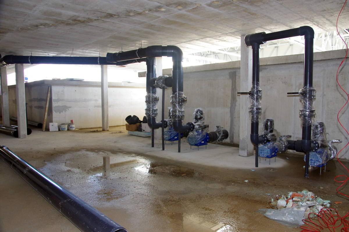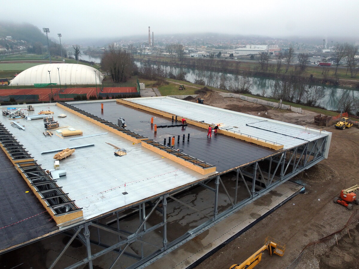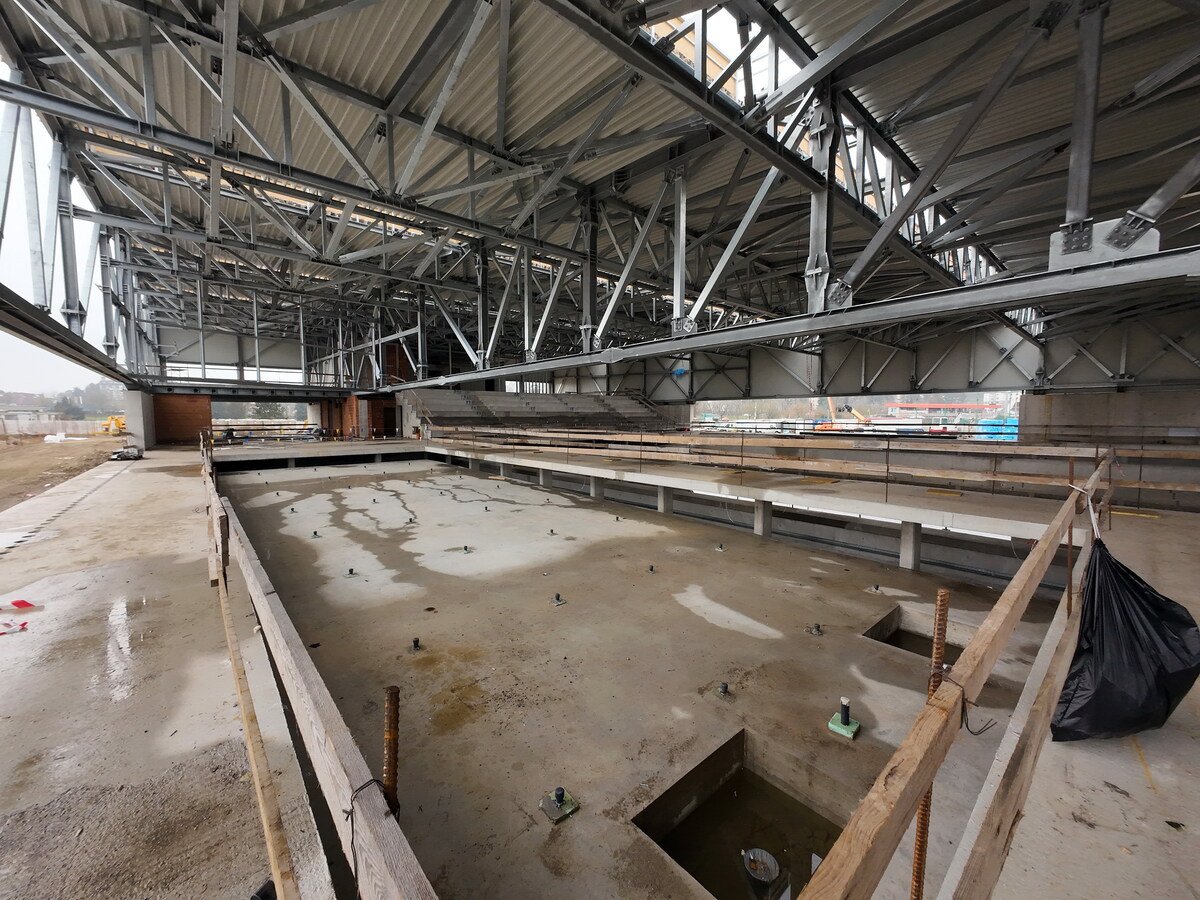 V pomladnih in poletnih mesecih so se dela intenzivno nadaljevala. Med drugim se je izvedlo betoniranje obeh bazenskih školjk ter kompenzacijskih bazenov, izdelala se je pritlična plošča, pozidale so se stene v kletnih prostorih in izvedla hidroizolacija okoli objekta. Vgrajene so bile tudi strojne in elektroinštalacije, ki so del betonske konstrukcije, hkrati pa se je začela montaža jeklene konstrukcije. Poleg tega so bile zabetonirane stene nad pritlično ploščo, pripravili pa so se tudi načrti za panelno in stekleno fasado.