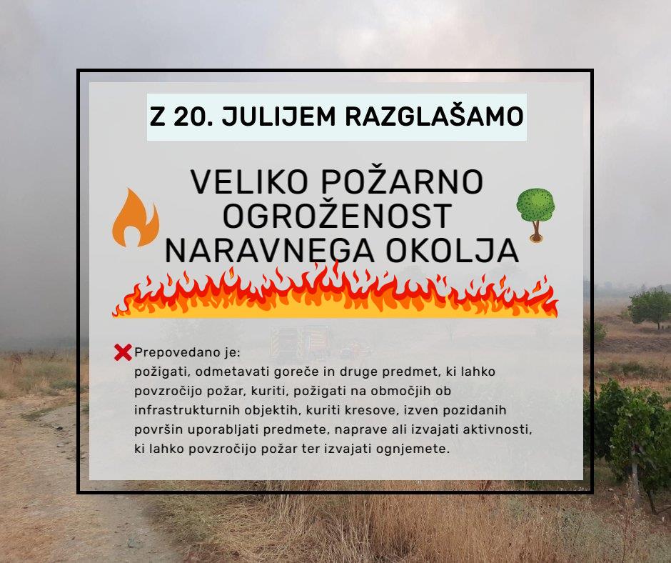 Ljubljana, Krško, 19. julij 2022 - Uprava RS za zaščito in reševanje z 20. julijem 2022 razglaša veliko požarno ogroženost naravnega okolja. Povsod po državi je v naravnem okolju poleg požiganja in odmetavanja gorečih ali drugih predmetov ali snovi, ki lahko povzročijo požar, prepovedano tudi kuriti, požigati na območjih ob infrastrukturnih objektih, kuriti kresove, izven pozidanih površin uporabljati predmete, naprave ali izvajati aktivnosti, ki lahko povzročijo požar ter izvajati ognjemete. Inšpektorat Republike Slovenije za varstvo pred naravnimi in drugimi nesrečami in Policija bosta nad spoštovanjem razglasa oziroma upoštevanjem prepovedi izvajala poostren nadzor.