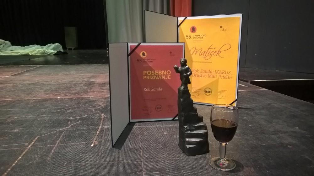 Na 55. Linhartovem srečanju, festivalu gledaliških skupin Slovenije in zamejstva, je slavilo Društvo Mali petelin s Senovega, ki je za predstavo Ikarus avtorja in režiserja Roka Sande prejelo nagrado - Matička za najboljšo predstavo v celoti, avtor oz. režiser pa je za besedilo prejel tudi diplomo. Ob tem uspehu je danes avtorju čestital tudi župan občine Krško mag. Miran Stanko.