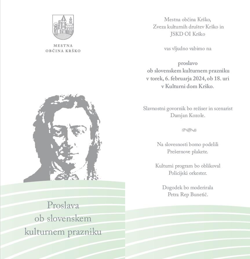 Mestna občina Krško, Zveza kulturnih društev Krško in JSKD OI Krško vabimo na proslavo ob slovenskem kulturnem prazniku, ki bo 6. februarja ob 18. uri v Kulturnem domu Krško. Slavnostni govornik bo režiser in scenarist Damjan Kozole.