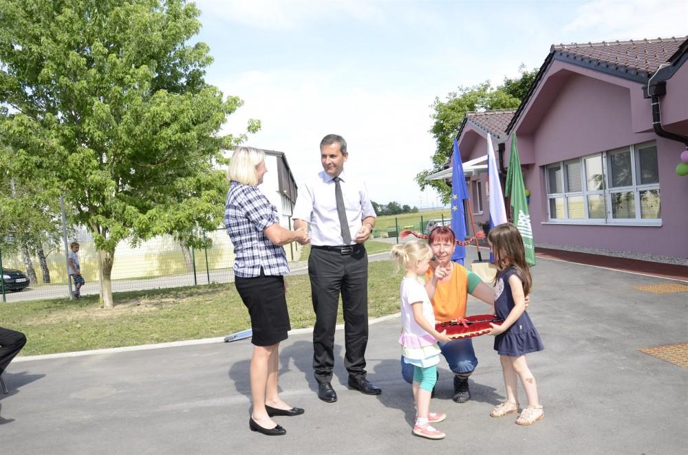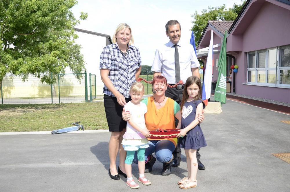 Župan občine Krško mag. Miran Stanko in ravnateljica OŠ Leskovec pri Krškem Jožica Repše sta na včerajšnji slovesnosti ob zaključku obnove enote vrtca Pika Nogavička pri OŠ Leskovec pri Krškem simbolično malčkom predala ključ dozidanega in energetsko saniranega vrtca.
