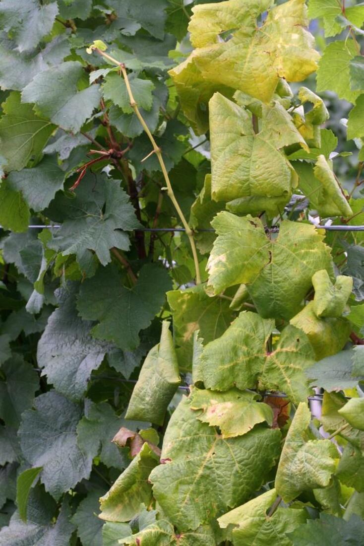 Obolelost se kaže z značilnim rdečenjem ali rumenenjem listov (odvisno od sorte, zvijanjem robov navznoter, venenjem in sušenjem grozdov.
