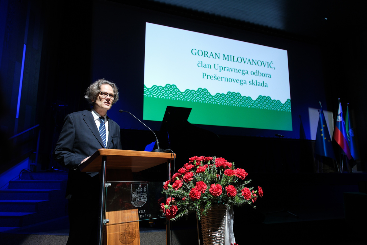 Slavnostni govornik je bil član Upravnega odbora Prešernovega sklada in direktor Galerije Božidar Jakac Goran Milovanović, ki je poudaril, da kultura ni nekaj samoumevnega ali zaključenega, temveč živ prostor, ki nastaja iz ustvarjalnosti, predanosti in skupnosti. Posebej je izpostavil pomen ljubiteljske kulture, ki temelji na prostovoljnosti, osebni motivaciji in povezanosti ljudi, ter poudaril, da ta ni manjvredna profesionalni kulturi, temveč z njo tvori neločljivo celoto – srce in razum kulturnega prostora. Ob tem je spomnil tudi na vizionarske odločitve v preteklosti, ko je lokalno okolje kulturo razumelo kot temelj razvoja, ter izpostavil vlogo Galerije Božidar Jakac kot pomembnega regionalnega in mednarodnega kulturnega središča. Posebno pozornost je namenil umetniški zapuščini Toneta Kralja, ki s svojo etično držo, družbeno odgovornostjo in evropsko razsežnostjo ostaja izjemno aktualen tudi danes. Govor je sklenil z mislijo, da kultura ni razkošje, temveč nuja – prostor pomena, solidarnosti in skupnosti, ki lahko tudi iz manjšega okolja nagovarja svet.