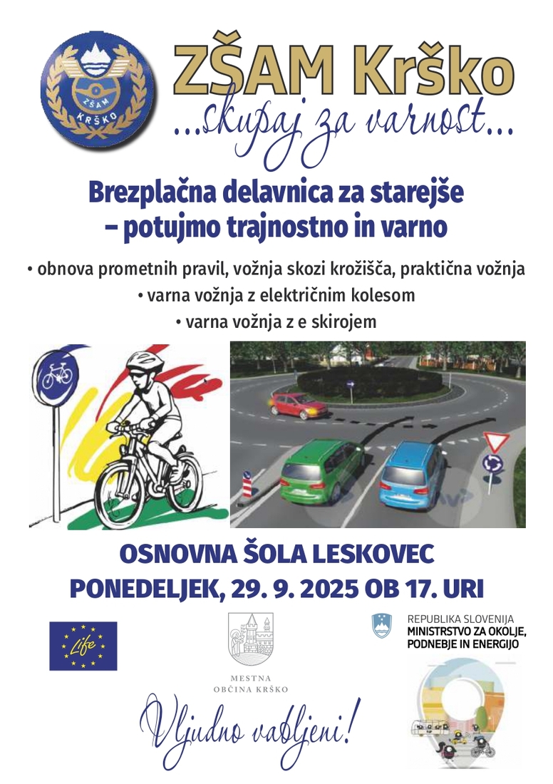 V ponedeljek, 29. septembra, ob 17. uri, vljudno vabljeni v Osnovno šolo Leskovec na brezplačno delavnico obnove pravil cestnega prometa za starejše, ki jo v sodelovanju z Mestno občino Krško organizira Združenje šoferjev in avtomehanikov Krško. Delavnica bo odlična priložnost, da obnovite svoje znanje o cestno prometnih pravilih ter tako poskrbite za svojo varnost in varnost ostalih udeležencev v prometu.