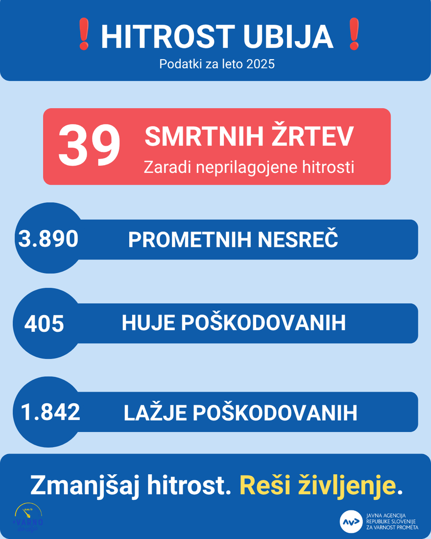 Neprilagojena hitrost ostaja eden ključnih dejavnikov prometne varnosti. V letu 2025 se je na slovenskih cestah zgodilo 3.890 prometnih nesreč zaradi neprilagojene hitrosti, v katerih je umrlo 39 ljudi, 405 je bilo huje, 1.842 pa lažje poškodovanih. V primerjavi z letom 2024 se je število smrtnih žrtev povečalo za 30 %. Tudi letos so posledice zaskrbljujoče – v prvih treh mesecih leta 2026 je zaradi hitrosti umrlo že 9 ljudi.